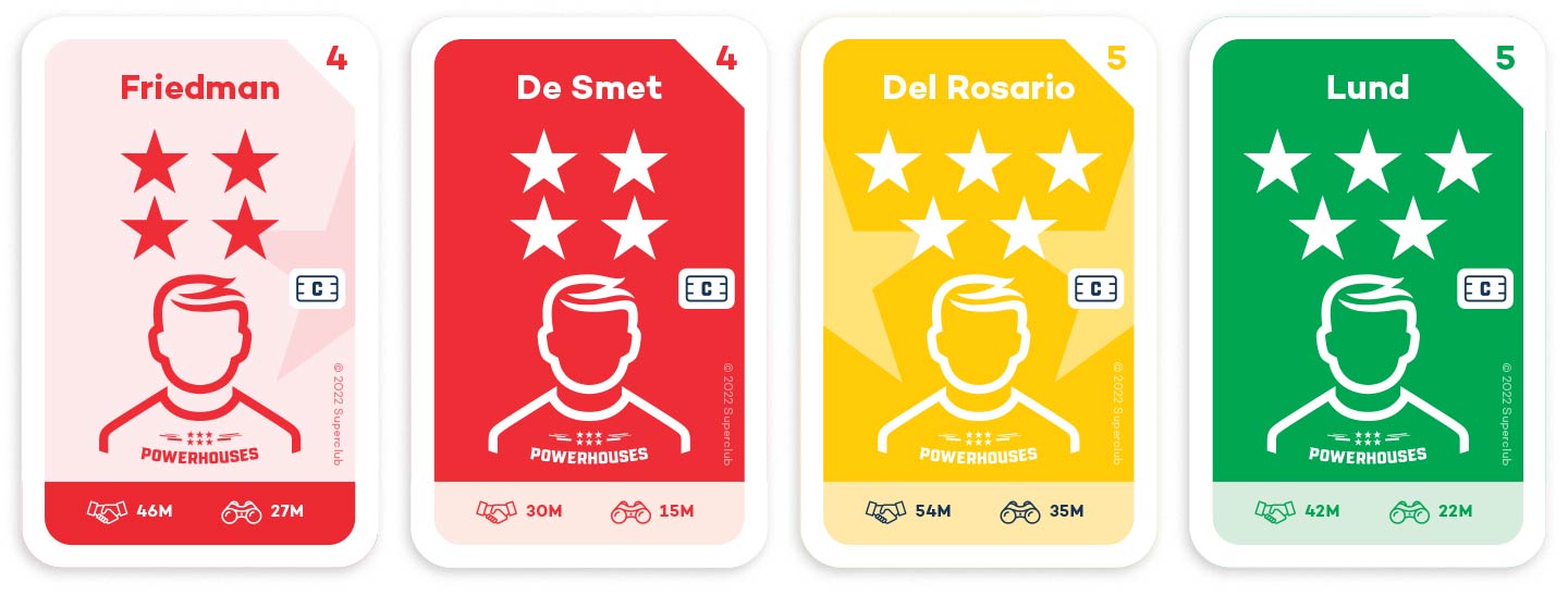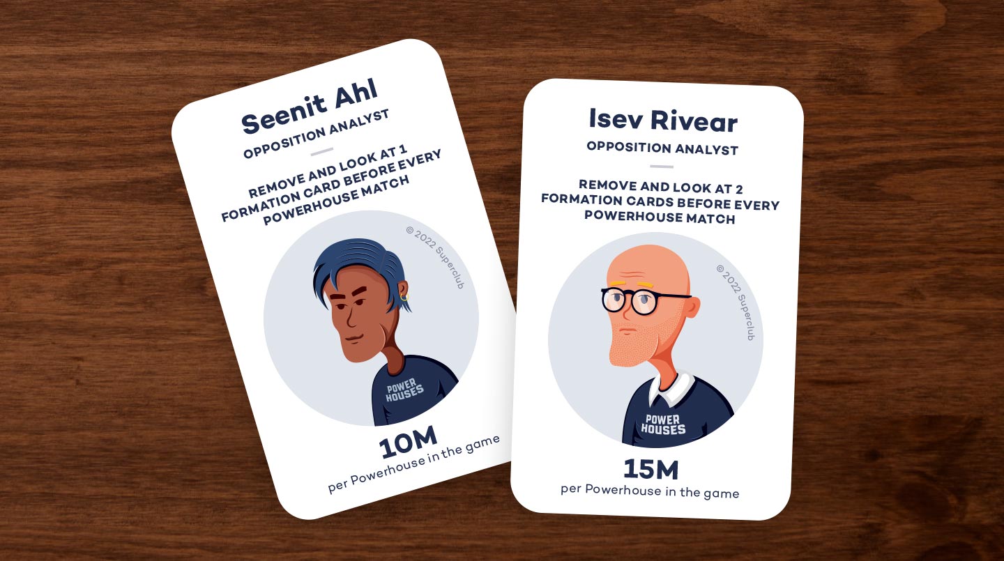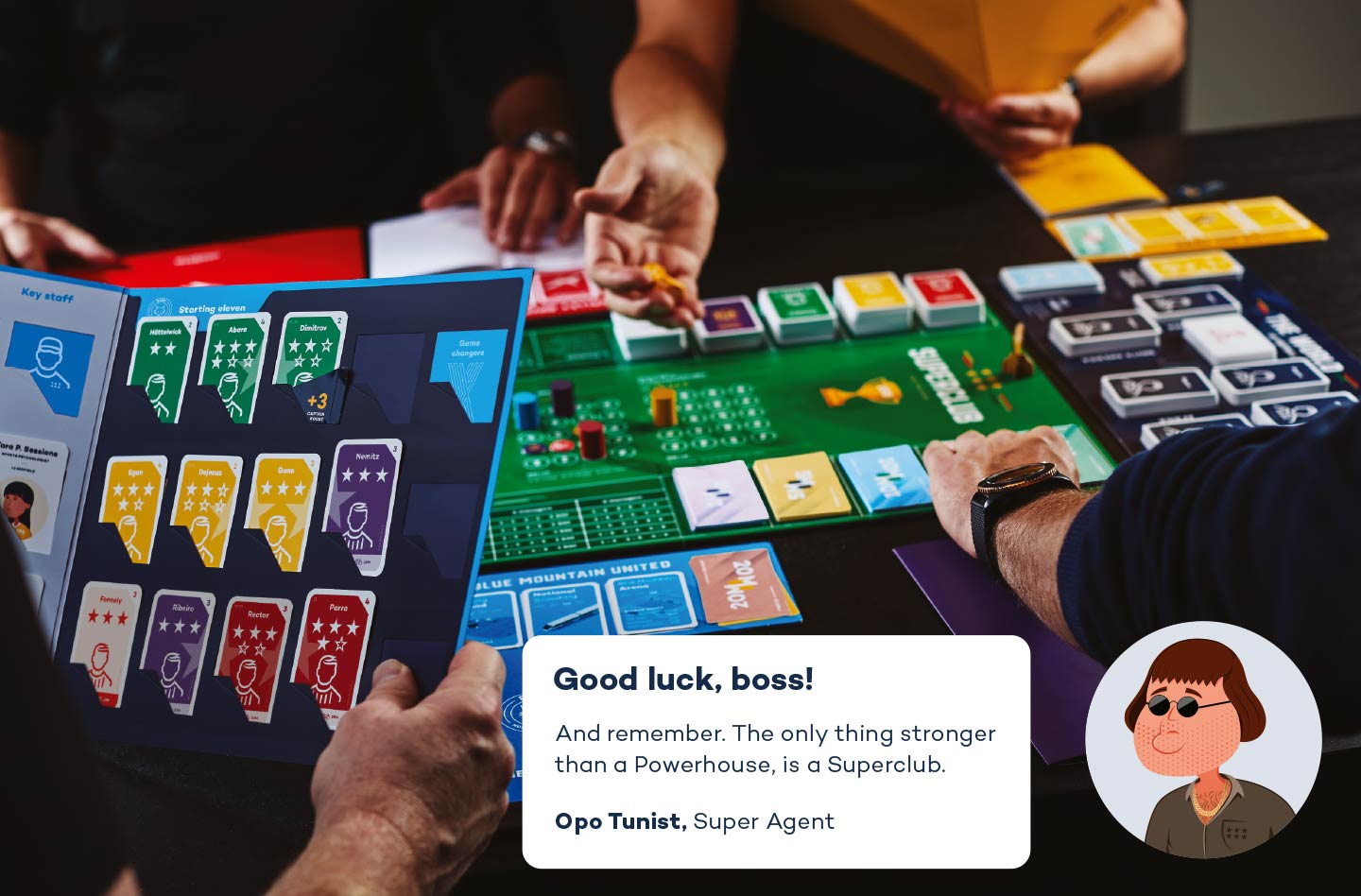 Powerhouses can’t win the game. The winning criteria of Superclub almost remain the same as in the original game. The only change: two SuperCup cards are enough to play the final. Powerhouses don’t receive income, pay wages, invest in infrastructure or Key staff or buy/sell players. However, Powerhouses do get SuperCup card for winning a season. They’ll never play the final, but if one Powerhouse get’s 3 SuperCup cards, all 6-star player’s in the game leave their respective clubs. Receivescoutingprice (found by the handshake symbol in the bottom of the player cards) from the bank as a transfer fee for each player.