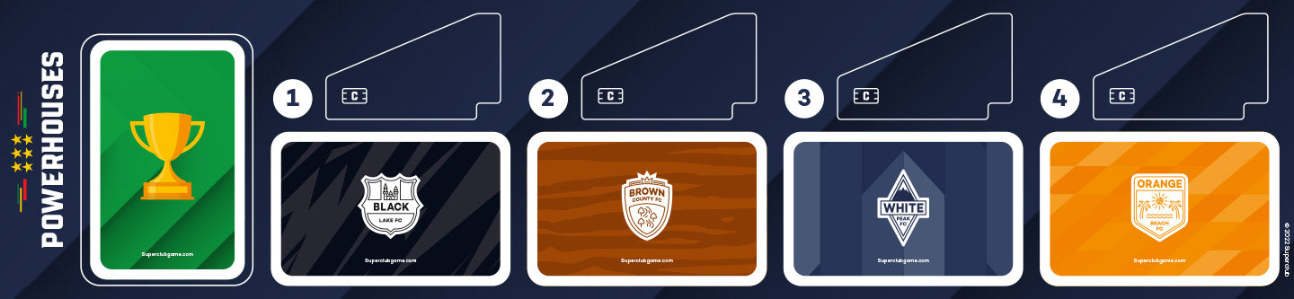 Place the Powerhouses board at the bottom of the Superclub board. Shuffle the green -Season cards and place on the board. Select as many Powerhouse clubs as you need to bring the total number of clubs (Managers + Powerhouses) to six. If fewer than 4 Powerhouse clubs, place them in the slot with the lowest available number (slot 1 if 5 managers, slots 1 and 2 if 4 managers, slots 1, 2 and 3 if 3 managers). It does not matter in which slot you place which Powerhouse. Shuffle the player cards and Key staff into the main decks. Keep the Powerhouses developed players as a separate deck.
