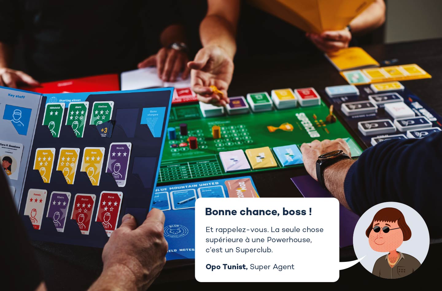 Placez le tableau Powerhouses au bas du tableau Superclub. Mélangez les cartes saison vertes et placez-les sur le tableau. Sélectionnez autant de clubs Powerhouse que nécessaire pour porter à six le nombre total de clubs (Managers + Powerhouses). S’il y a moins de 4 clubs Powerhouse, placez-les dans le créneau avec le nombre le plus bas disponible (emplacement 1 si 5 managers, emplacements 1 et 2 si 4 managers, emplacements 1, 2 et 3 si 3 managers). Peu importe dans quel créneau vous placez un Powerhouse donné. Mélangez les cartes de joueur et le personnel clé dans les decks principaux. Gardez les joueurs Powerhouses développés en tant que deck distinct.