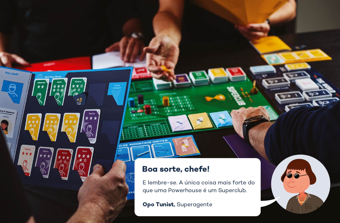Coloque o tabuleiro Powerhouses na parte inferior do tabuleiro Superclub. Baralhe as cartas verdes da temporada e disponha-as no tabuleiro. Selecione quantos clubes Powerhouse forem necessários para elevar o número total de clubes (Treinadores + Powerhouses) para seis. Se houver menos de 4 clubes Powerhouse, coloque-os no slot com o menor número disponível (slot 1 se 5 treinadores, slots 1 e 2 se 4 treinadores, slots 1, 2 e 3 se 3 treinadores). O slot em que coloca as diferentes Powerhouses é indiferente. Baralhe as cartas dos jogadores e o pessoal-chave nos baralhos principais. Mantenha os jogadores desenvolvidos das Powerhouses como um baralho separado.